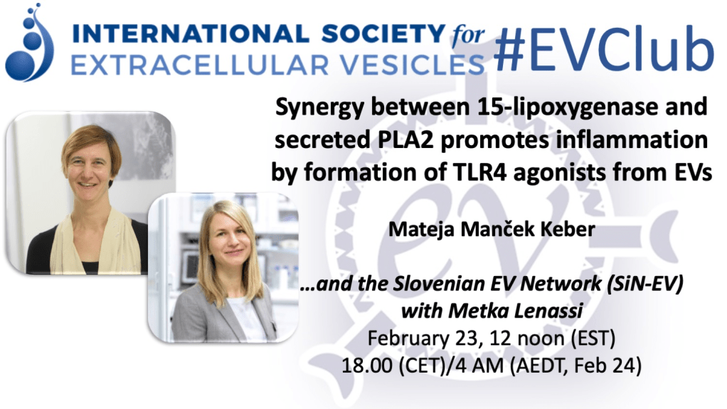 This week, #EVCLub is a collaboration with the Slovenian EV Network (SiN-EV): Mateja Manček Keber presents “Synergy between 15-lipoxygenase and secreted PLA2 promotes inflammation by formation of TLR4 agonists from EVs” https://www.pnas.org/content/117/41/25679.